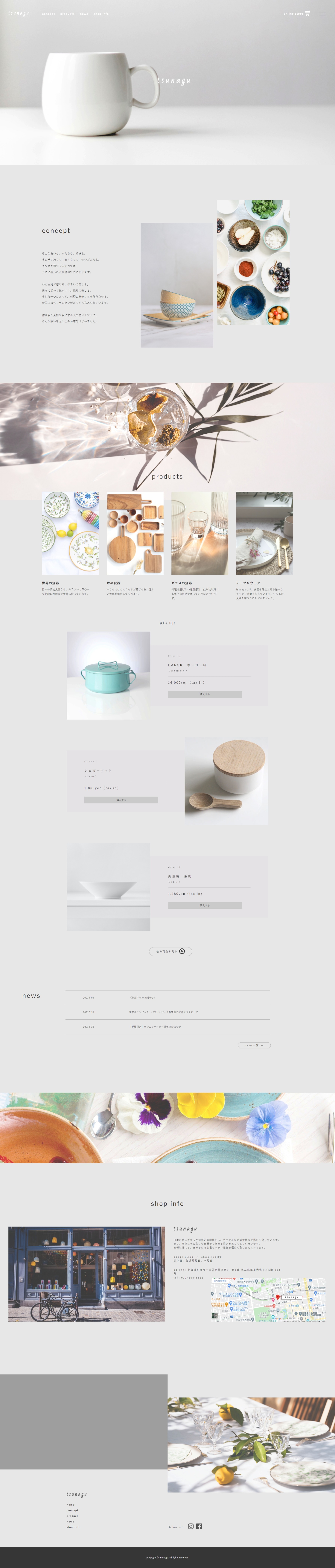 日本の伝統的な陶器から、北欧の食器まで幅広く取り扱う。白やグレーを基調としながらもカラフルな写真を多く用いたり、視線の動きが単調にならないようコンテンツの配置を工夫しました。透明感溢れるおしゃれなサイトを目指しました。
